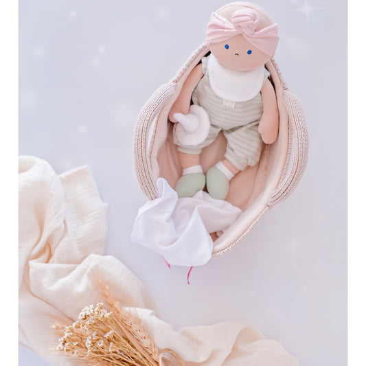 Soft Baby Doll with Knitted Carry Cot - Green outfit