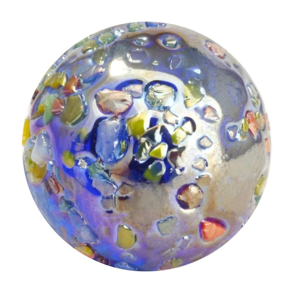 Glitterbomb is one of our favourite marbles. It is a silver/grey machine-made marble with flecks of colour on the outside creating a textured marble. It also has a lustered finish.