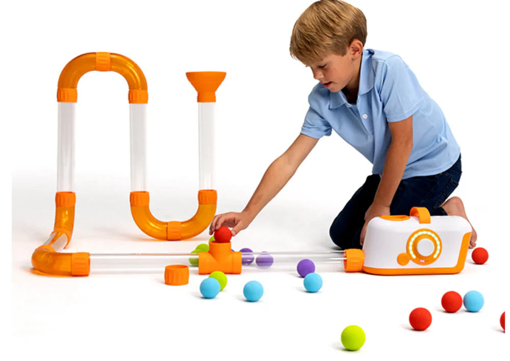 - Kid-safe turbine that sends foam balls flying through a network of modular tubes