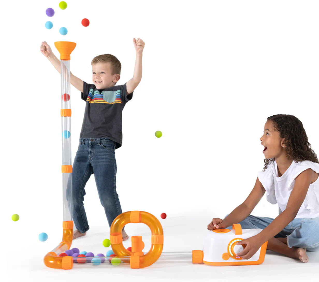 Arrange the tubes and connectors in any way you can imagine. Create loops and swirls. Weave them under tables and over desks. Then, switch on the turbine and let the experimentation begin... Can you make the foam balls leap from one tube to the next, or hover in mid-air, or go around and around in an endless cycle? Or, what happens when you set it to low speed vs high speed? What happens when you load the tubes with all the balls, then turn it all the way up? With hours of runtime and loads of balls, tubes, connectors, and accessories included, kids (and adults) will never want to stop exploring!
