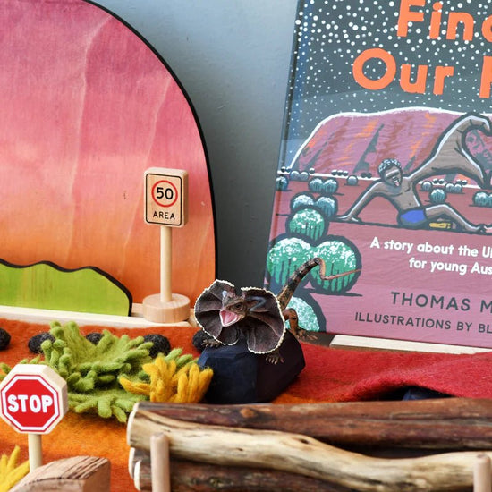 The Tara Treasures Large Australian Outback Desert playscape is a unique piece that is designed to reflect the colours and landscape of the Australian outback desert. With beautiful rusty red soil and sand, rock formations, sparse native bushes and a dirt road, it is the perfect backdrop to create an Australian-inspired small world setup.