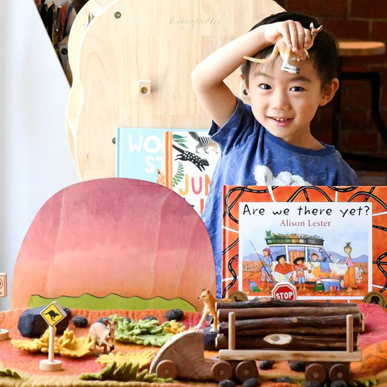 Create the perfect backdrop to an invitation to play, Tara Treasures felt playscapes work well with the full-sized animal figurines (from Schleich, Collecta or Safari Ltd) and wooden toys. At a length of 80cm, this Australian Outback playscape is large enough to play on a table top or it can be used as a floor mat. Once playing is done, the mat can be rolled up and fastened with a button.
