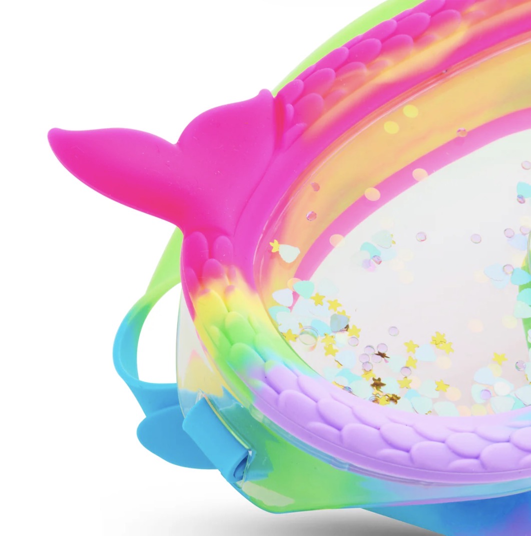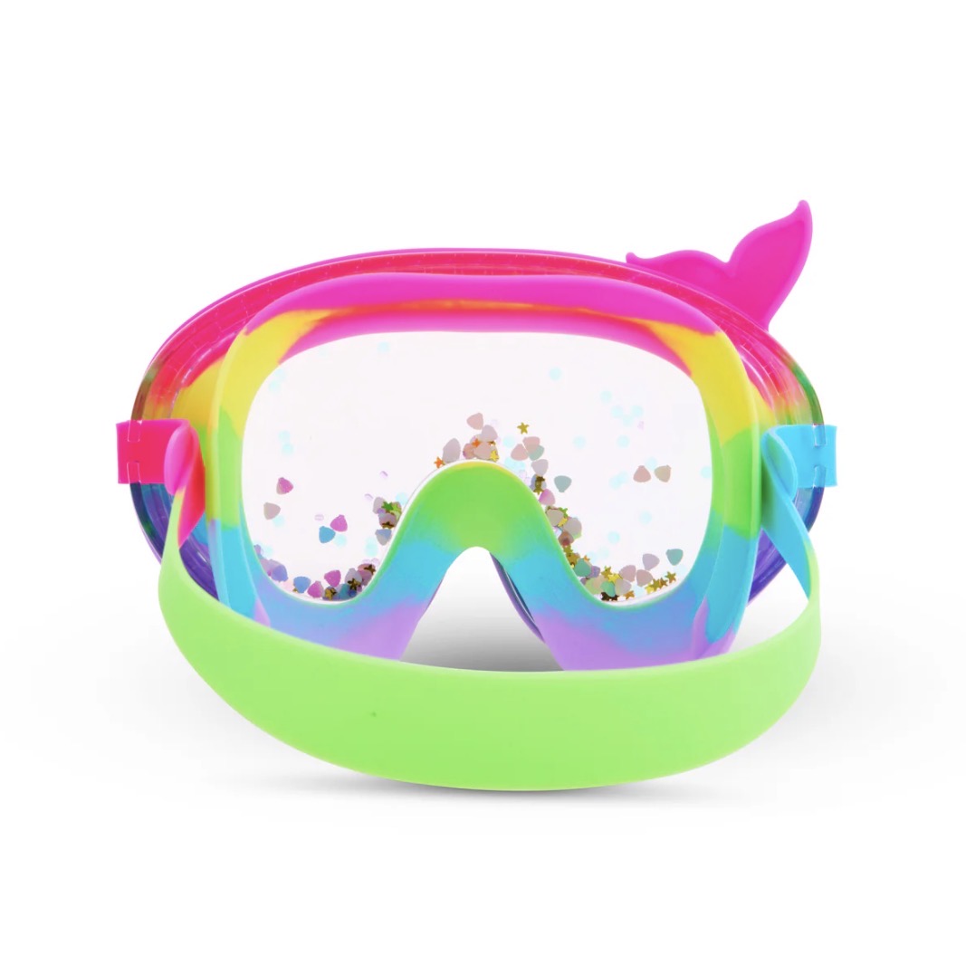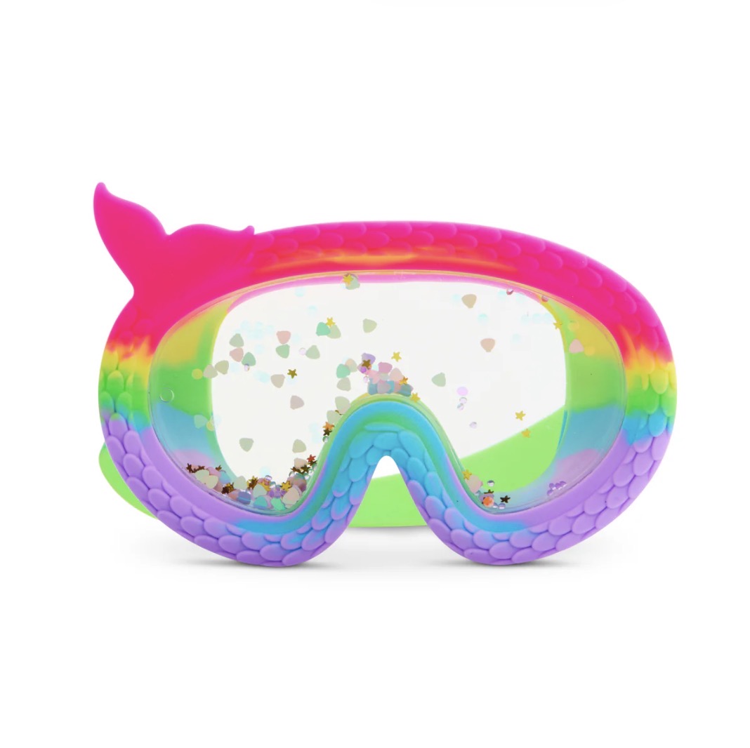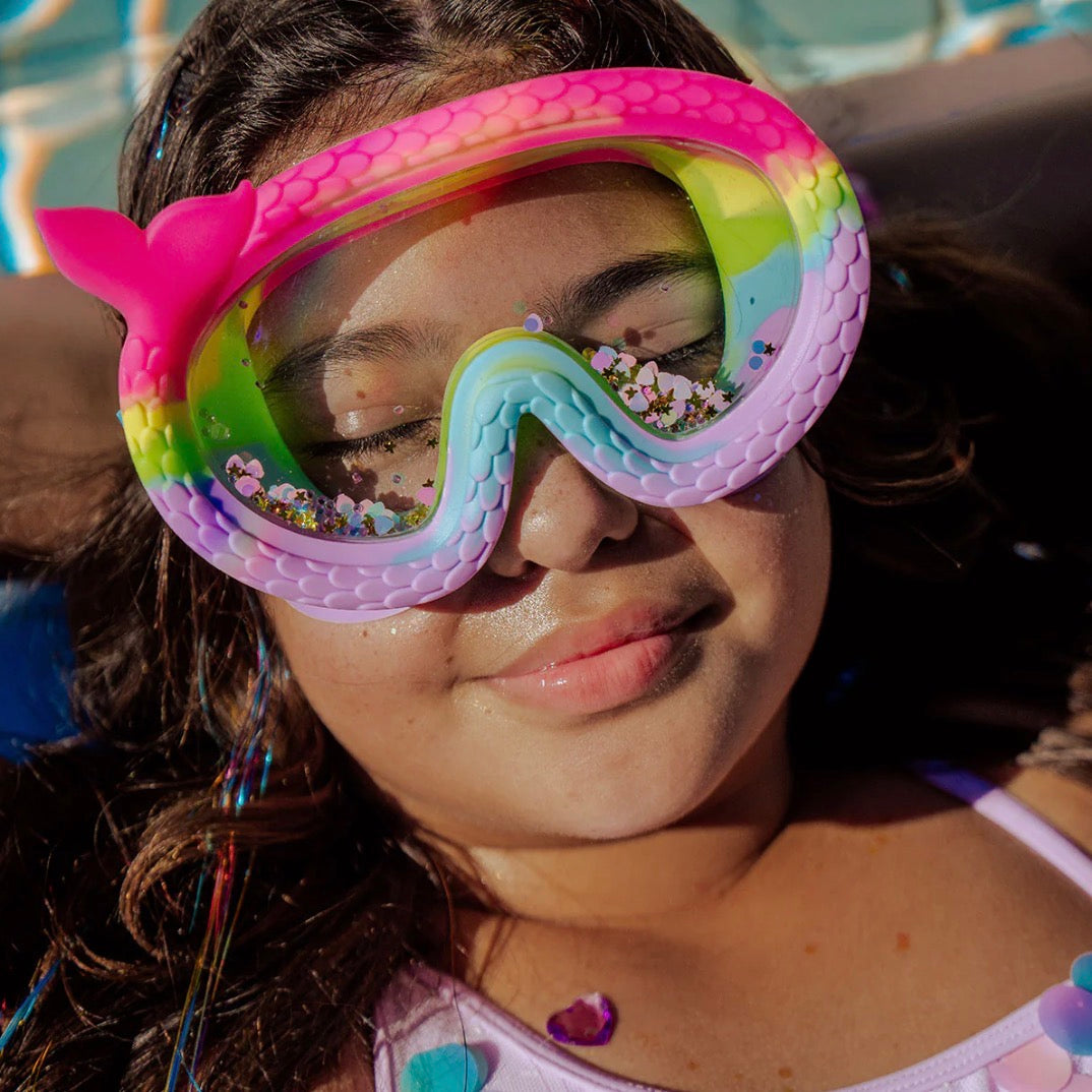 Summer shimmers brighter at Mermaid Cove! The Splash n’ Shimmer Mermaid Cove Swim Mask, designed for kids ages 6 and up, brings an enchanting underwater world to life. Featuring our signature double-lens swim mask filled with floating rainbow glitter, this mask creates a truly mystical aura. Designed for dreamy dives and magical moments, it also showcases a silicone mermaid tail frame, making every swim feel like an ocean fairytale!