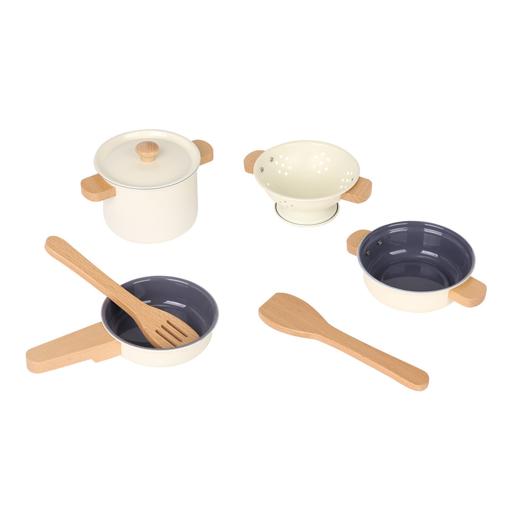 Perfect for little chefs, this set includes: Various pots and pans, colander, and cooking utensils. Crafted for endless imaginative play, this set encourages creativity, fine motor skills, and a love for cooking.