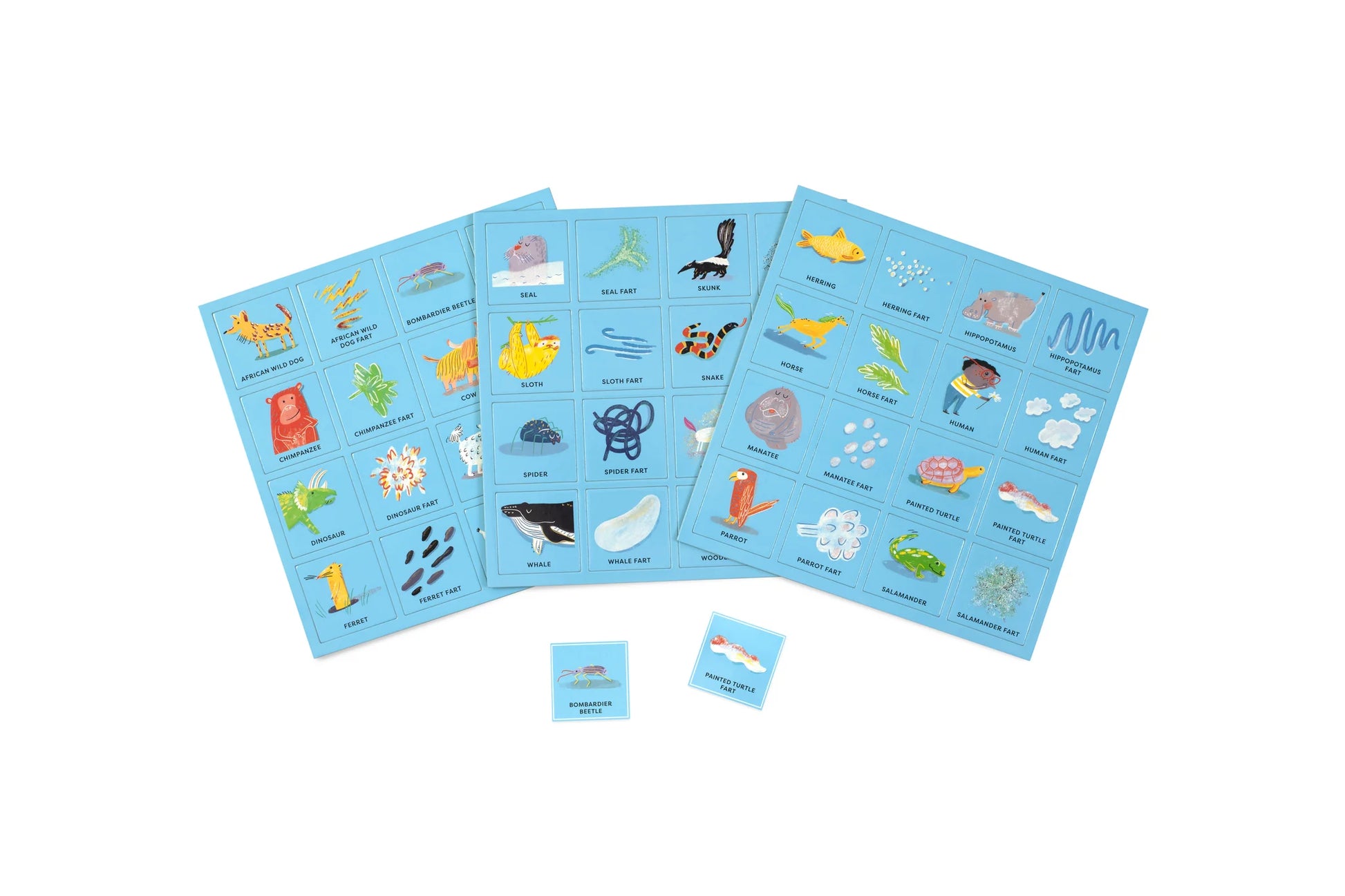 Be the first to fill your bingo card with animals and their hilariously illustrated farts and win, BINGO!