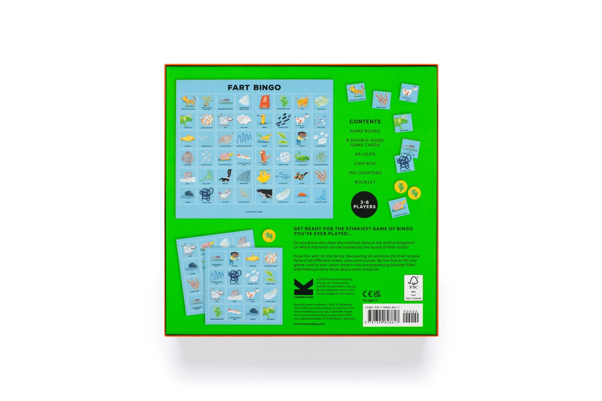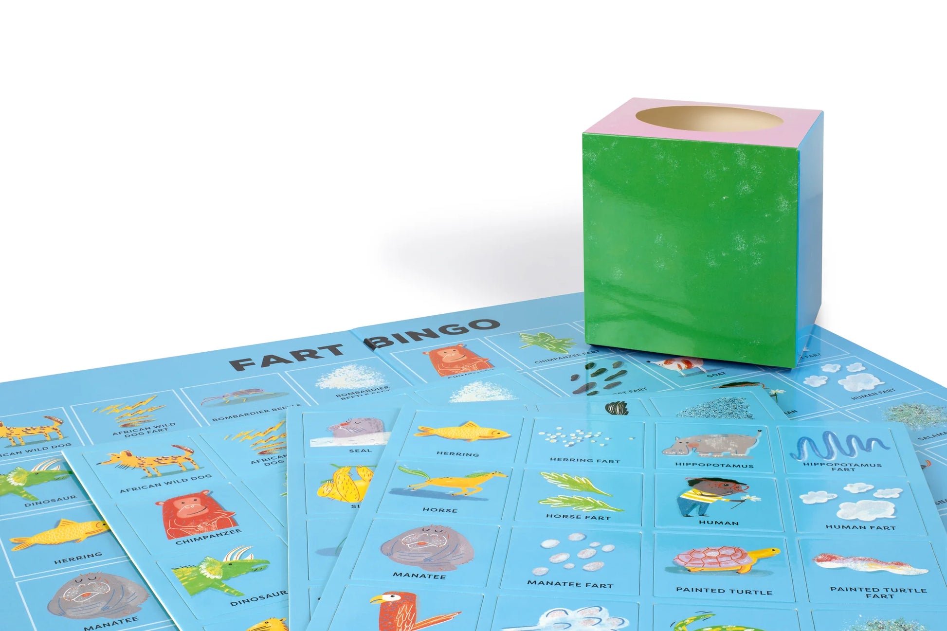 Explore the silly side of nature with 24 animals and their uniquely shaped, sized and coloured farts featured in this family bingo game. With hilarious illustrations, fascinating farty facts and quick to learn rules, Fart Bingo will have you giggling and guffawing in no time.