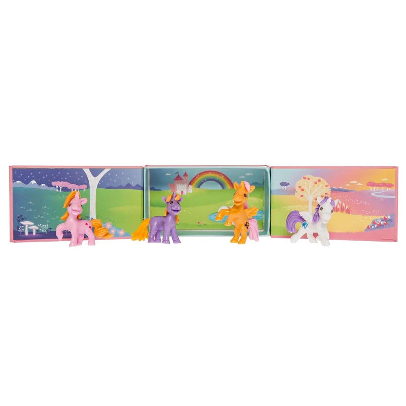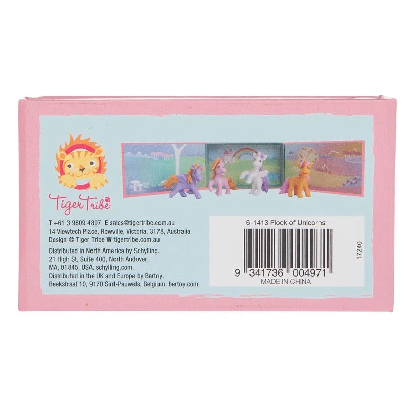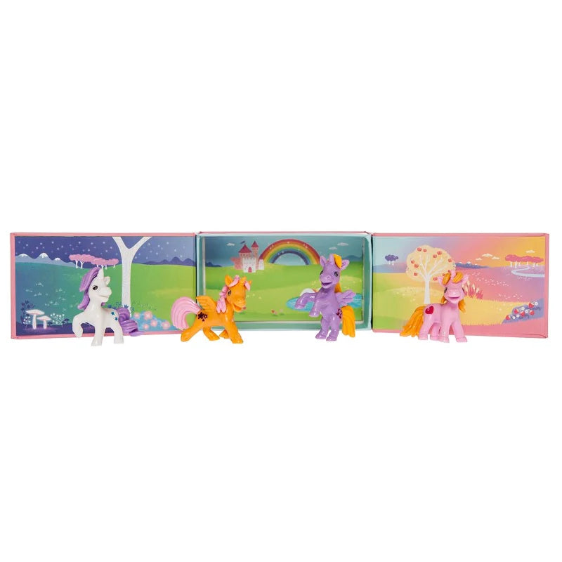 The ultimate in pocket-sized portable play - now you can take your Flock of Unicorns everywhere! Create your own on-the-go adventures with four magical mini unicorns. Each box converts into a beautifully illustrated back drop for play and display.