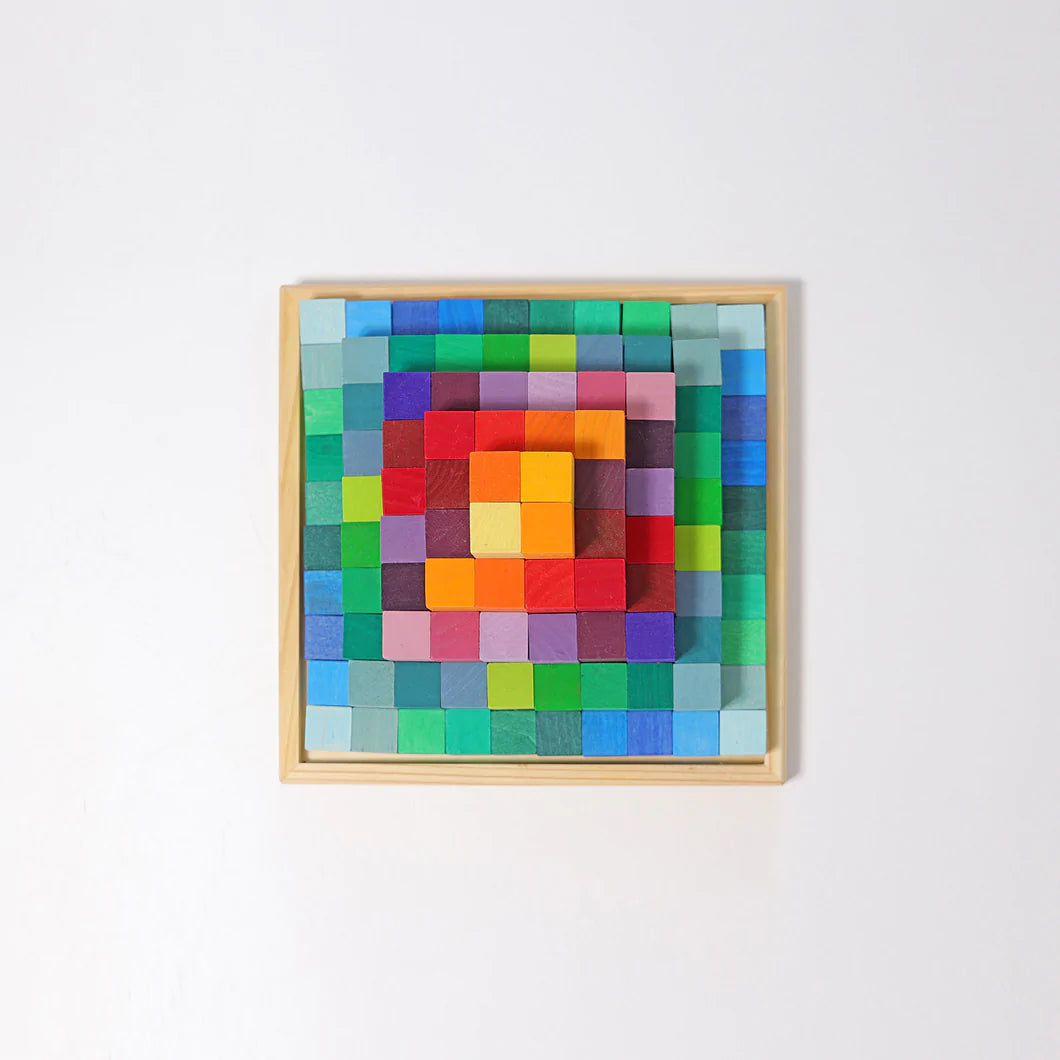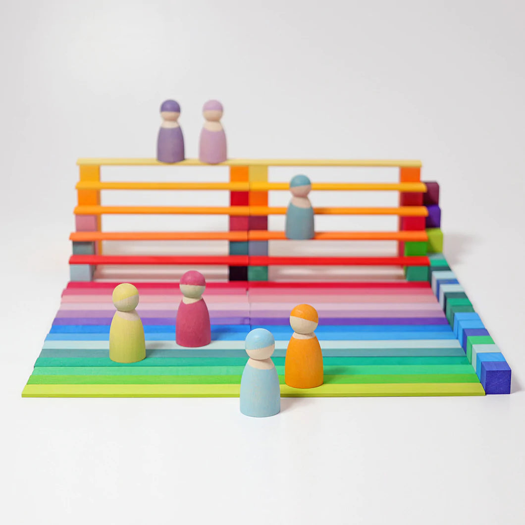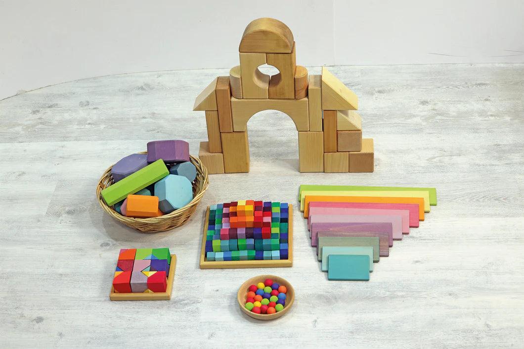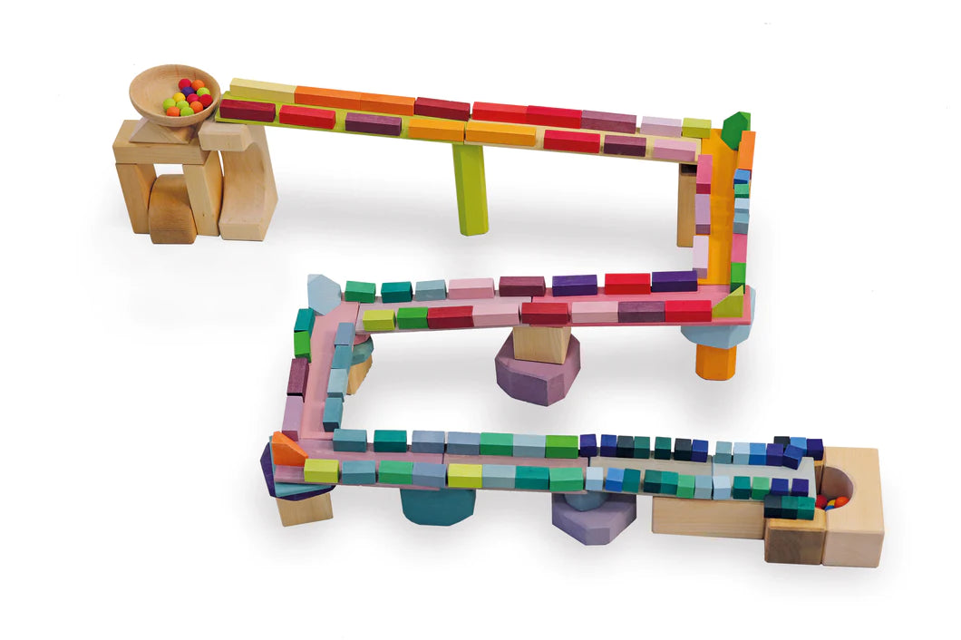 The Grimm's Small Stepped Pyramid is one of the most outstanding and open-ended toys Grimm's has to offer. Children can built magical palasts, castles, beautiful cities, towers and landscapes. They can create whatever their imagination is. This building set comes with 100 building blocks in bright colours in a nice wooden frame which can also be integrated as a part of the game. Because of its size it is also perfect for playing on the table, where different marble games can be played.