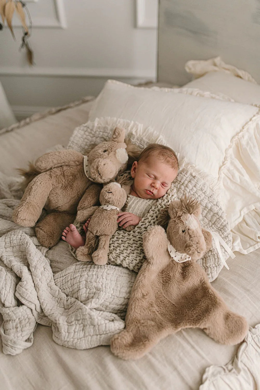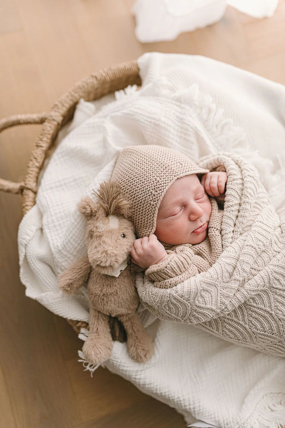 Harvey the Horse Rattle is a lumbering yet inquisitive foal with four left hooves, soft, chubby legs & a constant rattle in his belly. Harvey’s older cousin Diego the Donkey loves taking little Harvey to Luna Park to board the spooky Ghost Train—Harvey gets such a thrill from all the ghosts, bats & skeletons that his belly rattles excitedly throughout the entire ride.