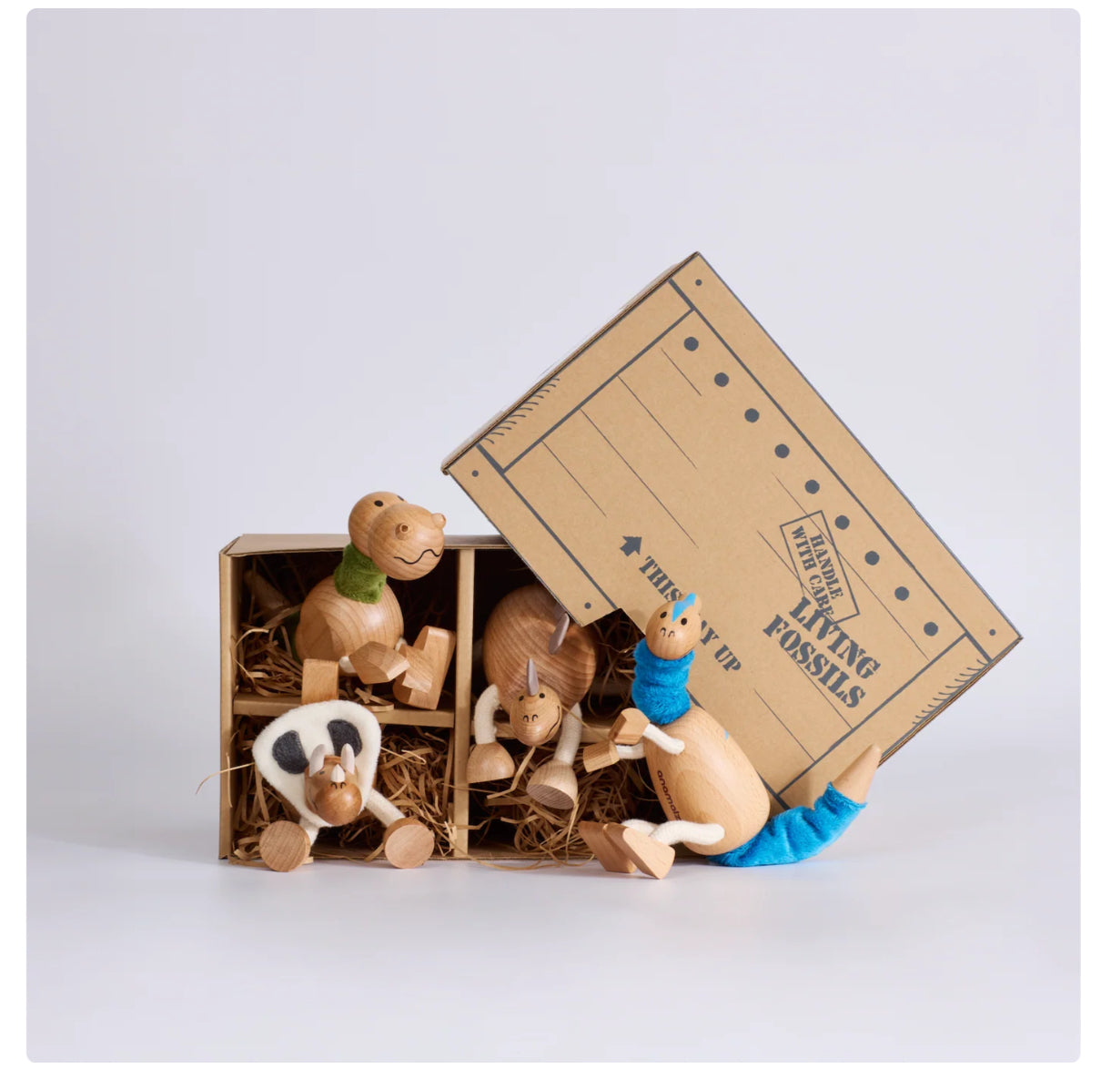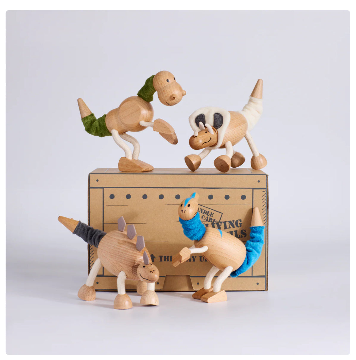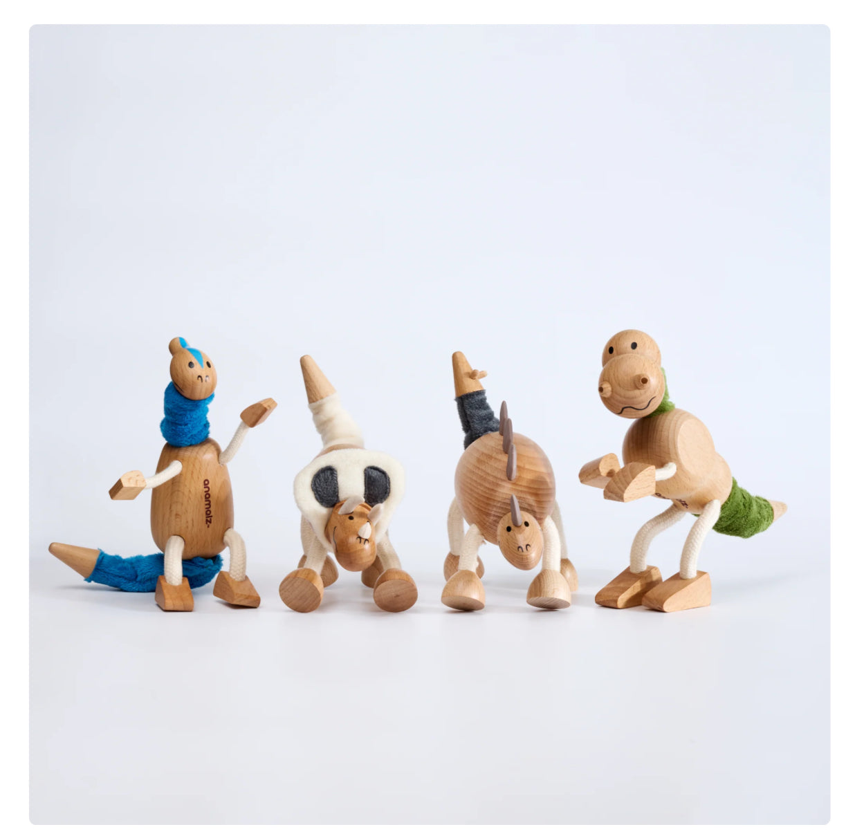 Parasaurolophus is a fossil-digging, marble-winning, story-time champ. Torosaurus is the soup-sharing, volleyball-spiking question master. Stegosaurus is your storm-listening, tail-wagging pal for life. And T-Rex? Bold, bendy, and rocking his cute wooden nostrils — always leading the fun. Together, they’re a dino gang made for stomps, roars, and Jurassic-sized adventures.