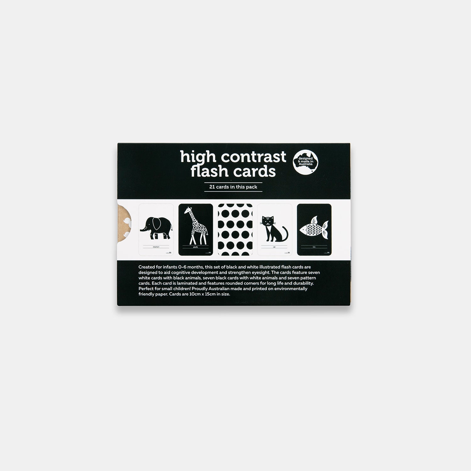 Created for infants 0-6 months, this set of black and white illustrated flash cards are designed to aid cognitive development and strengthen eyesight. The cards feature seven white cards with black animals, seven black cards with white animals and seven pattern cards. Each card is laminated and features rounded corners for long life and durability. Perfect for small children! Proudly Australian made and printed on environmentally friendly paper. Cards are 10cm x 15cm in size.