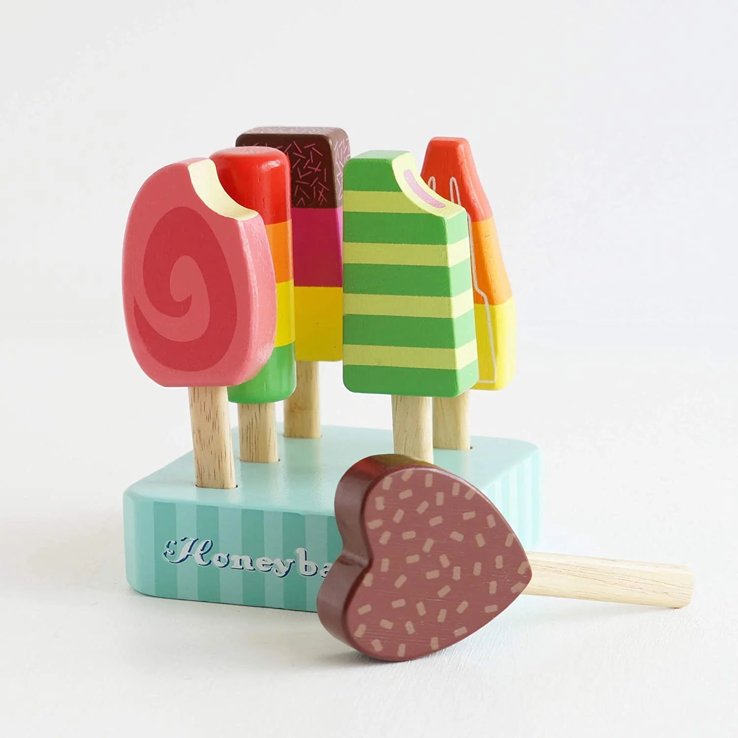 Cool down with a set of six brightly painted wooden ice-lollies, complete with a wooden holder and presented in a colour window box.