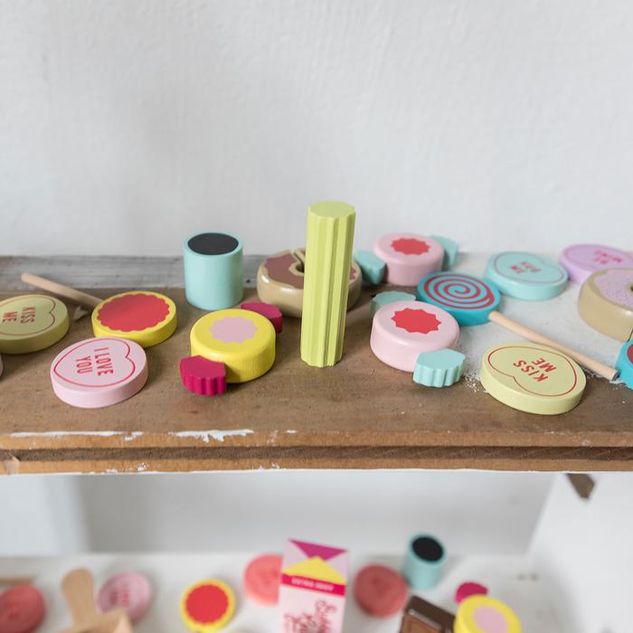Complete with 1 x clear candy jar with wooden Lid, 2 x lolly pops, 5 x heart sweets, 2 x musk sticks, gummy bear, pretzel, candy cane, 2 x chocolate freckles, 2 x donuts, chocolate bar, 4 x liquorice pieces, 2 x wrapped lollies, sherbet tube, chewing gum packet, bubble gum packet, wooden scoop and x5 paper lolly bags for pretend play