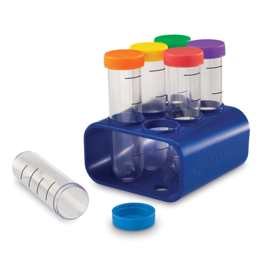 Primary Science Jumbo Test Tubes with Stand. 6 test tubes measuring 15.2cm x 3.8cm in diameter, different coloured lids (to track experiments), sturdy rack and Activity Guide
