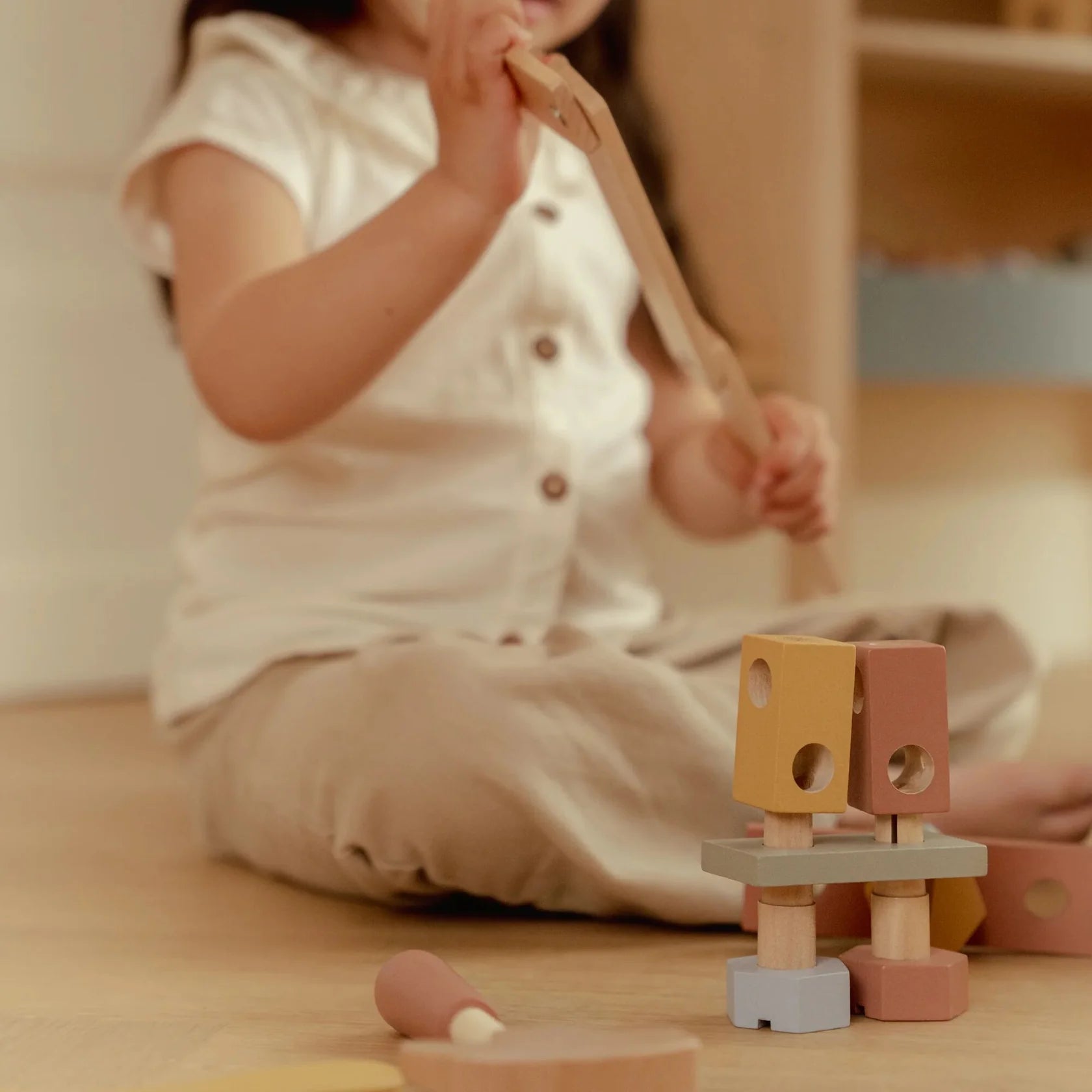 Everything a little carpenter needs! This wooden toolbox includes a hammer, screwdriver, and wrench—perfect for building the most wonderful creations. But that ’s not all – the sides of the box can also be used as a pounding bench! This way, little ones can hammer and screw while playfully developing their motor skills and creativity. Ready to get started?