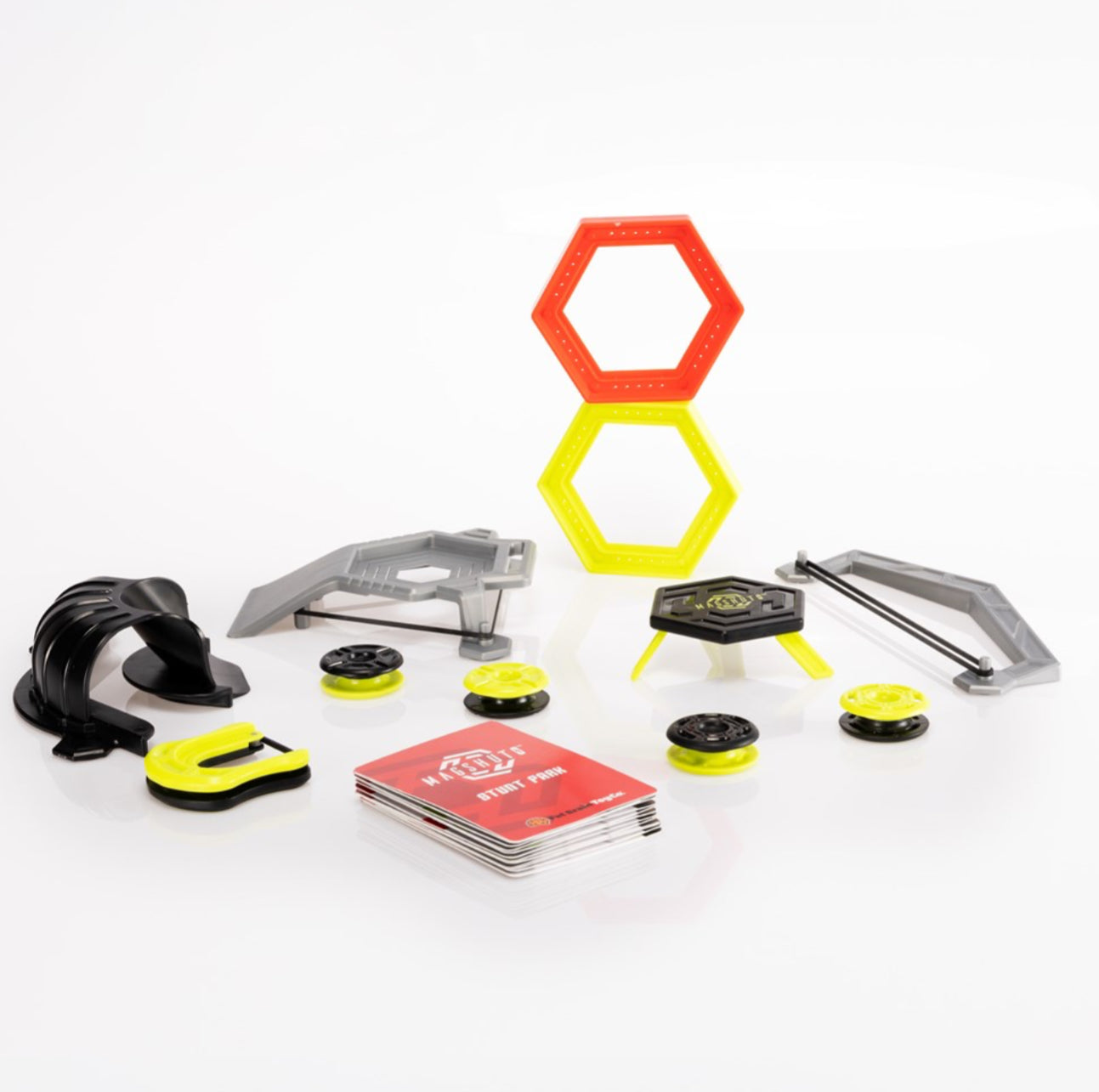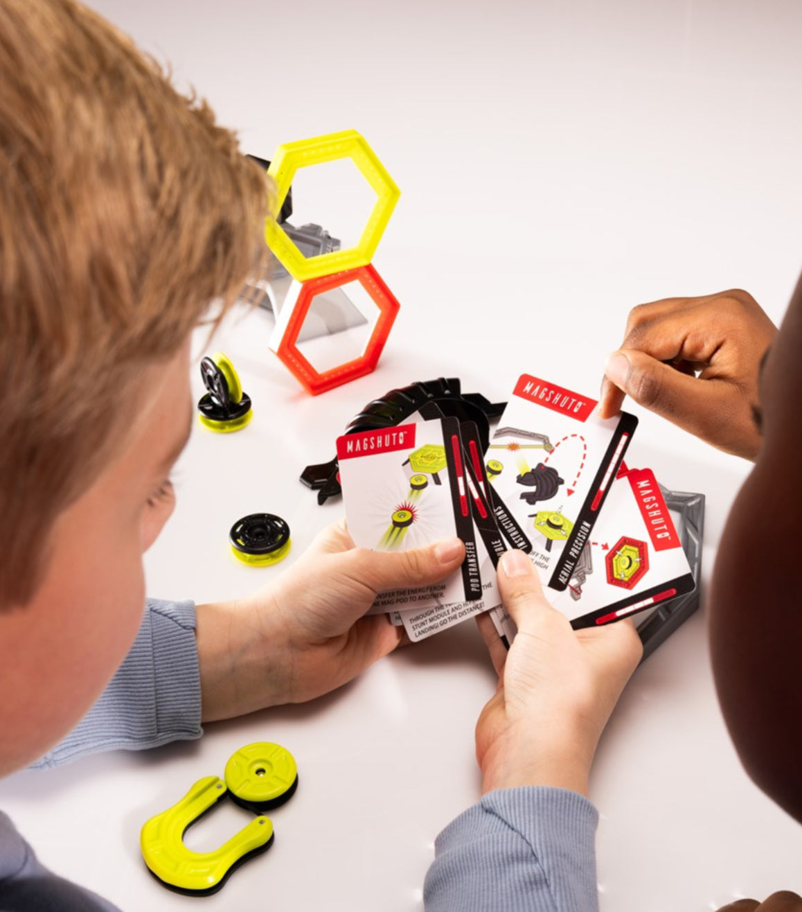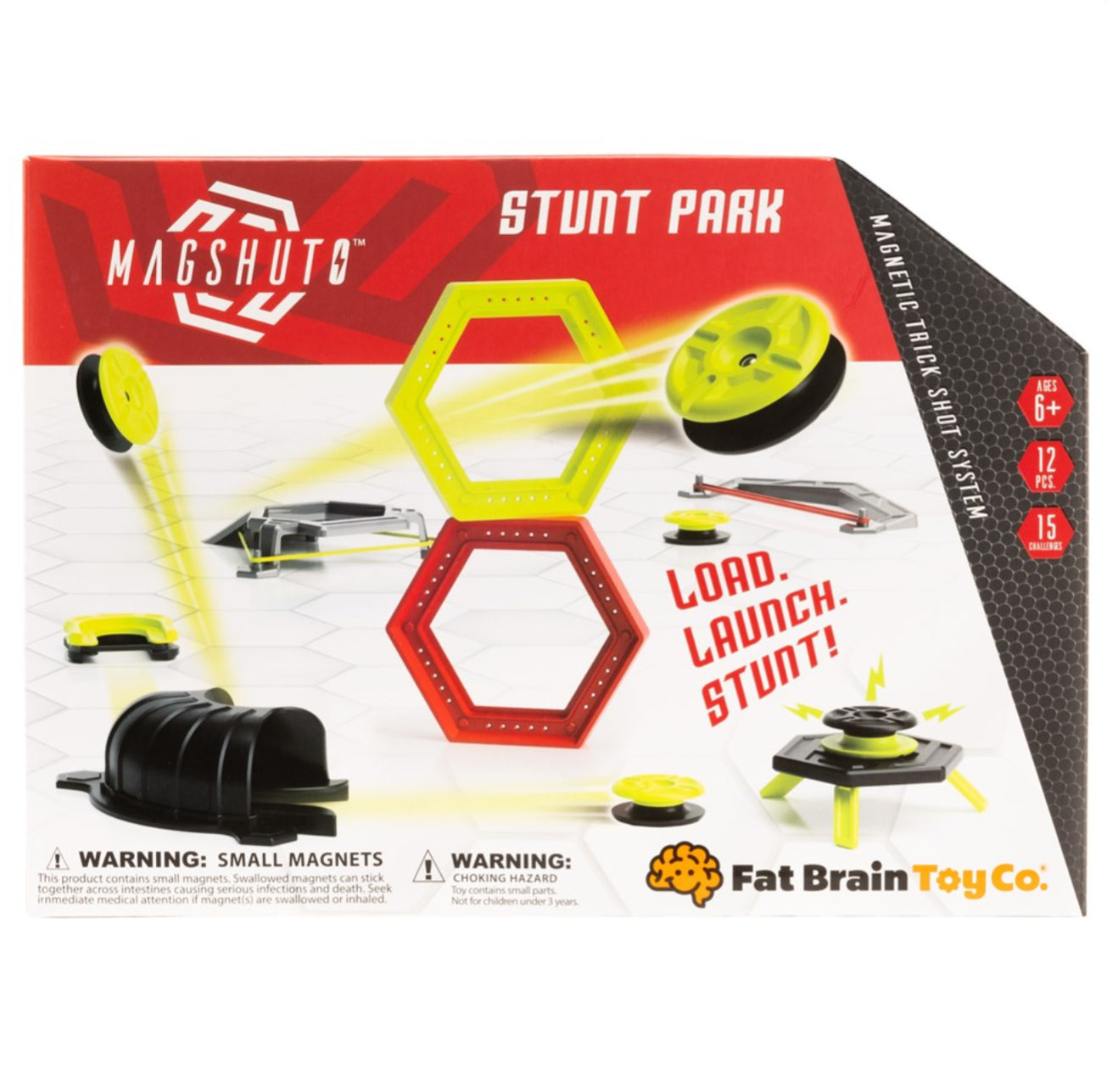 Mad, rad, magnetic action! This action-packed set features ramps, rebounders, rings, a tunnel, and a magnetic target - just about everything you need to build the most insane stunts. Set it up any way you want, then load one of the Mag-Pods into the shooter, pull it back with just your finger, aim, and launch. Ricocheting, rebounding, flipping, colliding, flying, tunnel-gliding, and more... Take on the 15 included challenges. Invent your own stunts. Combine with other Magshuto sets and incorporate your environment. The only limits are the laws of physics! Magshuto. Become a Trick Shot Master.