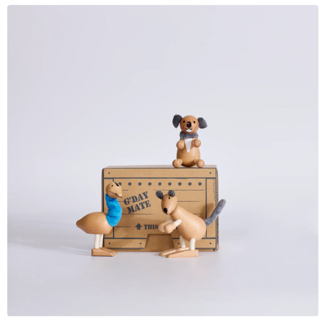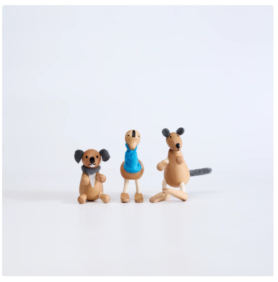 Three Aussie icons come together in one playful set — Koala, Kangaroo, and Emu. Koala is the cuddle-loving tree-hugger with a knack for loafing around. Kangaroo is the bouncy sidekick who never leaves home without her joey-sized spirit. And Emu? A curious dancer and chest-pecker with a flair for adventure. Together, they bring the wild heart of the outback straight into storytime.