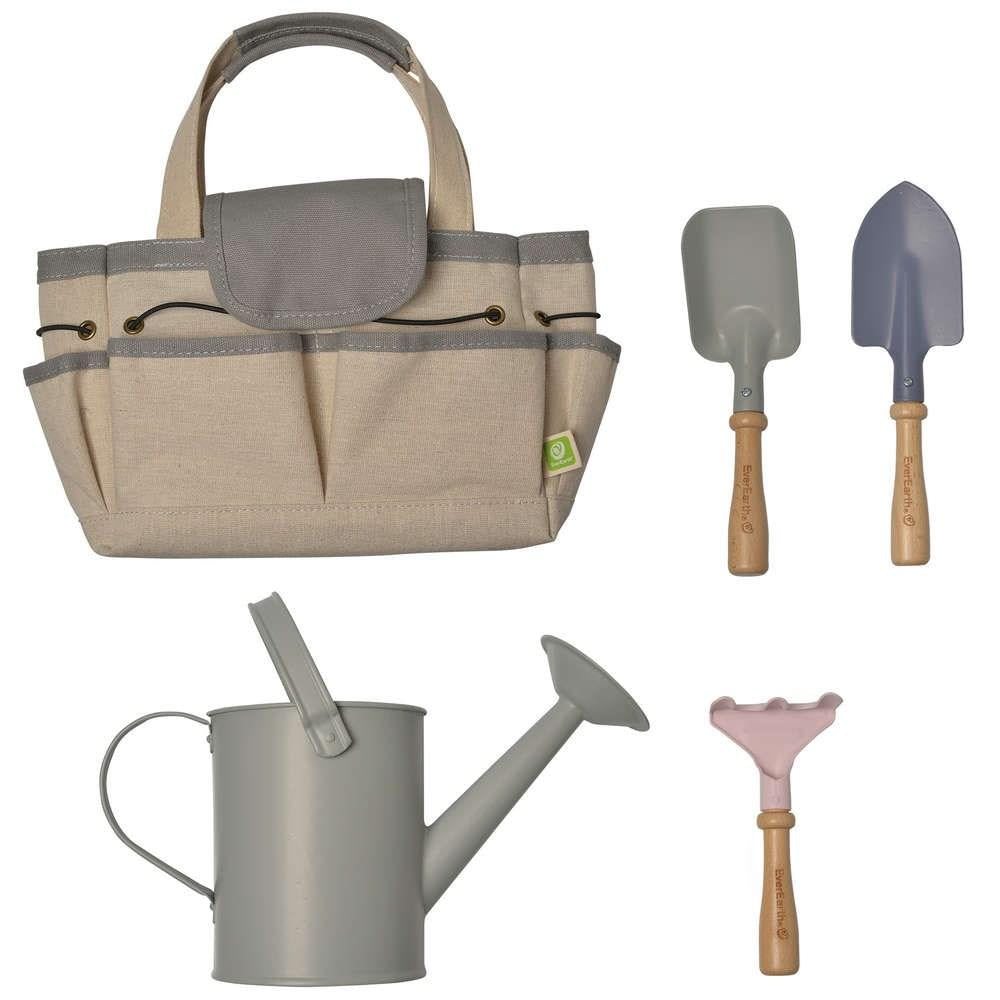 - The set contains a hand rake, a hand scoop, a hand trowel, a small watering can, and a practical canvas garden bag.