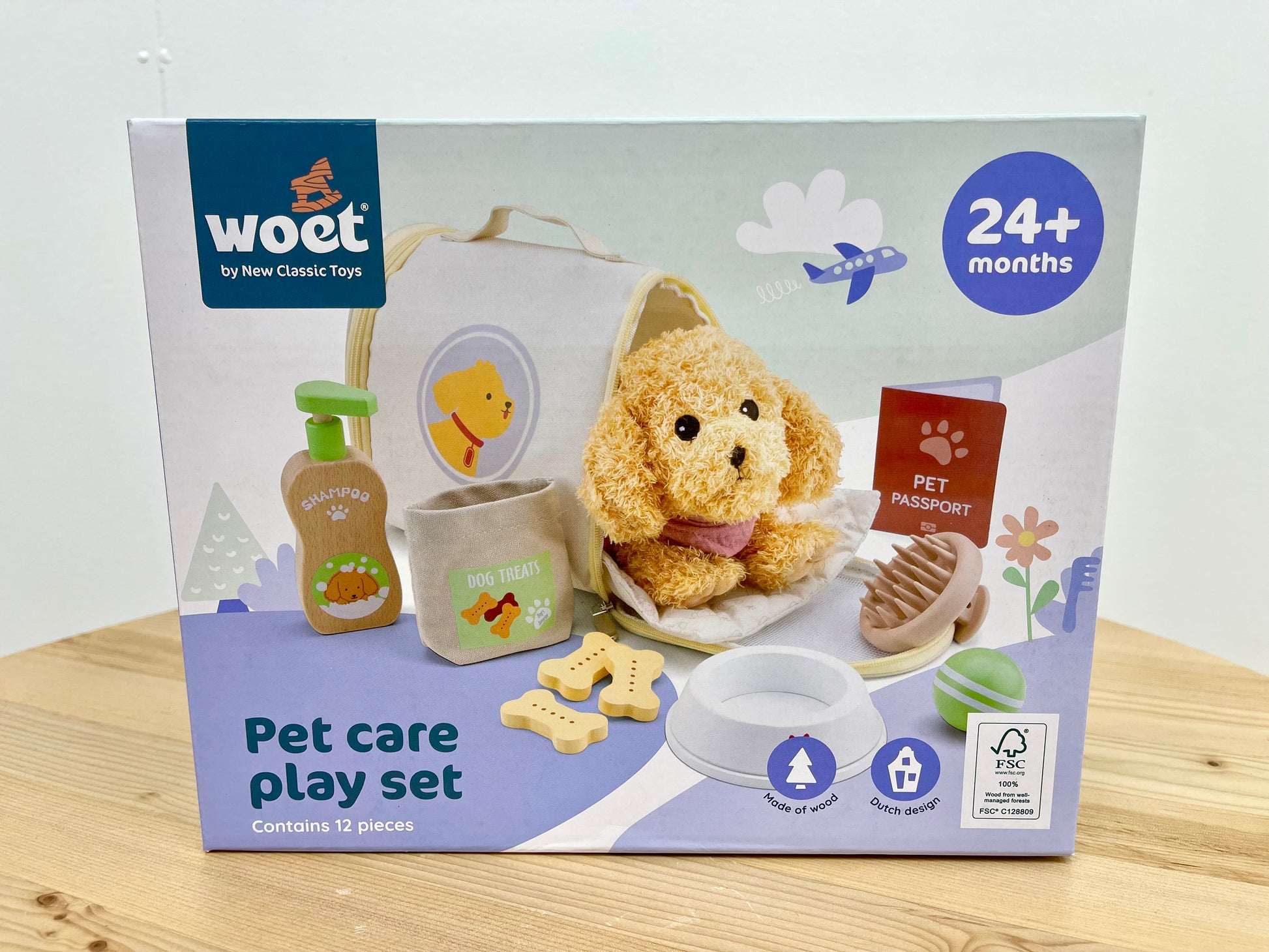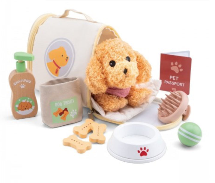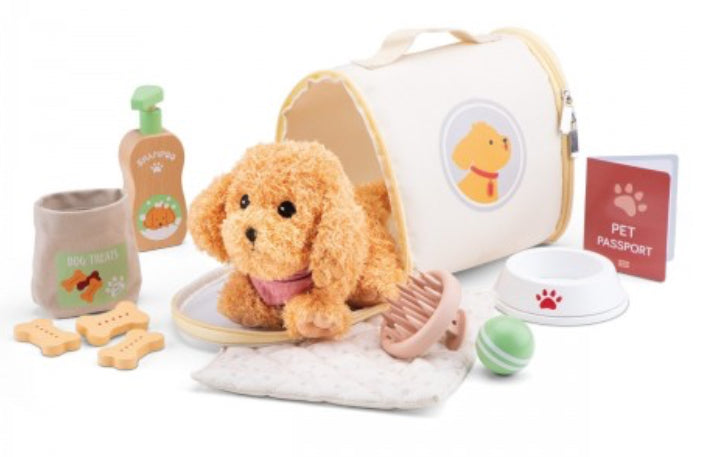 Inside, you'll find: A lovable puppy figure, perfect for pretend play and companionship. Pet shampoo to keep furry friends clean and fresh. Pet food for feeding time, promoting responsibility and empathy. A passport for documenting pet adventures and imaginary travels. A grooming brush to keep pets looking their best.