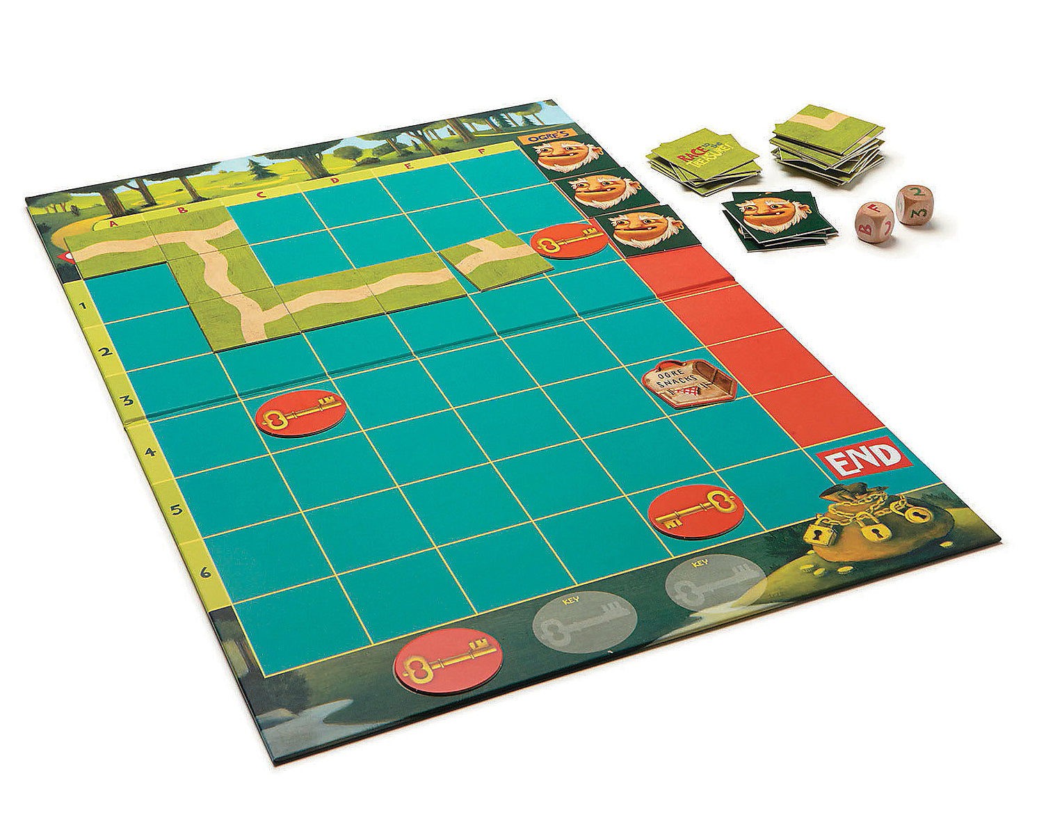 Players try to beat the ogre to the treasure by creating a path from START to END. Along the way they need to collect three keys to open the treasure. Players strategize, cooperate, and build the path together. If they do it before the ogre gets there, they all win! Kids love working together to defeat the ogre. Building onto a path encourages kids to think two steps ahead and to look at all possibilities.