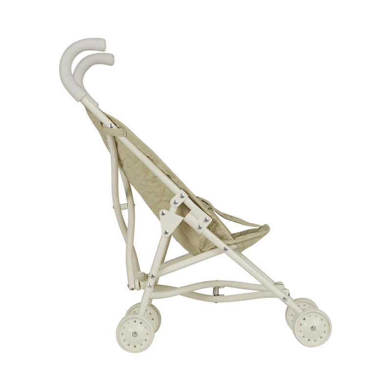 The Sollie Stroller includes a quilted cotton seat attached to a metal foldable frame, all conveniently stored in a stylish cotton canvas drawstring bag for easy transportation.