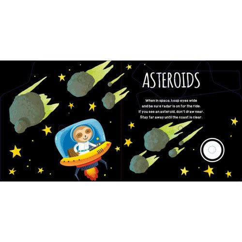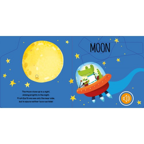 Read about the adventures of animals in space. Press the buttons to hear the sounds they make.