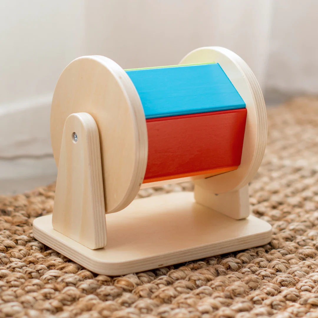 Perfect for practicing fine motor skills, coordination, and learning to reach with both hands at once. The Totli Rainbow Spinning Drum turns 360 degrees as it makes a gentle musical sound. Your little one will love gripping, spinning, and learning about cause and effect. A tummy-time favourite!