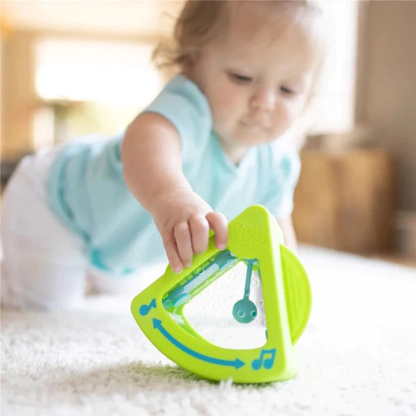 Between the two transparent windows is a little mallet suspended in the middle and a unique bell tone attached to either wall. Send it rocking and listen as the hammer swings back and forth to strike the bells. Young minds instantly light up with fascination! Simple yet endlessly mesmerizing, Tobble Tones is a unique cause-and-effect experience curious young minds can't help but come back to again and again.