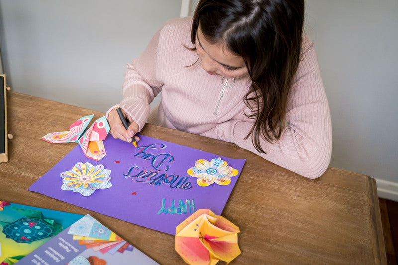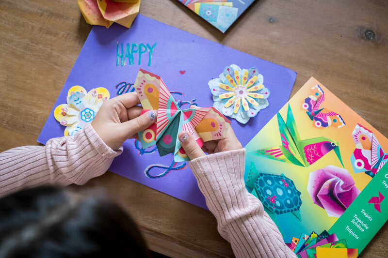 This vibrant origami set includes a collection of neon paper with instructions to fold and create a variety of animals and flowers found in the tropics.