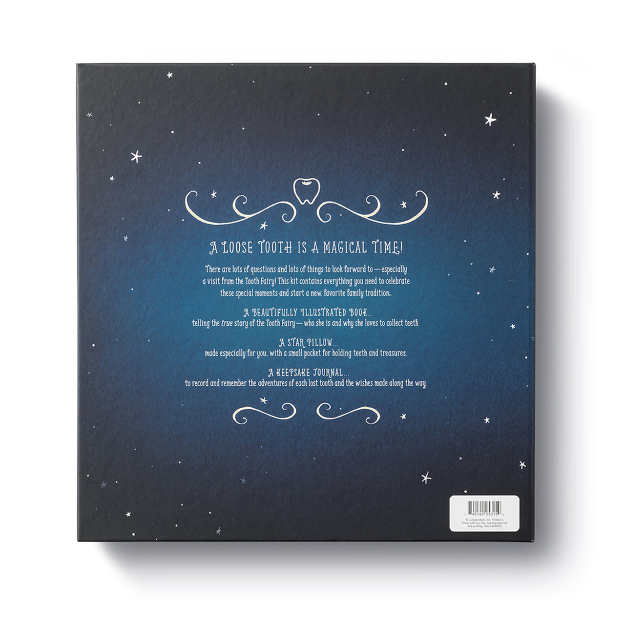 In addition to a beautifully illustrated book that tells the true story of the Tooth Fairy, this kit includes a star pillow with a small pocket for holding teeth and treasures, and a keepsake journal to record and remember the adventure of each lost tooth.
