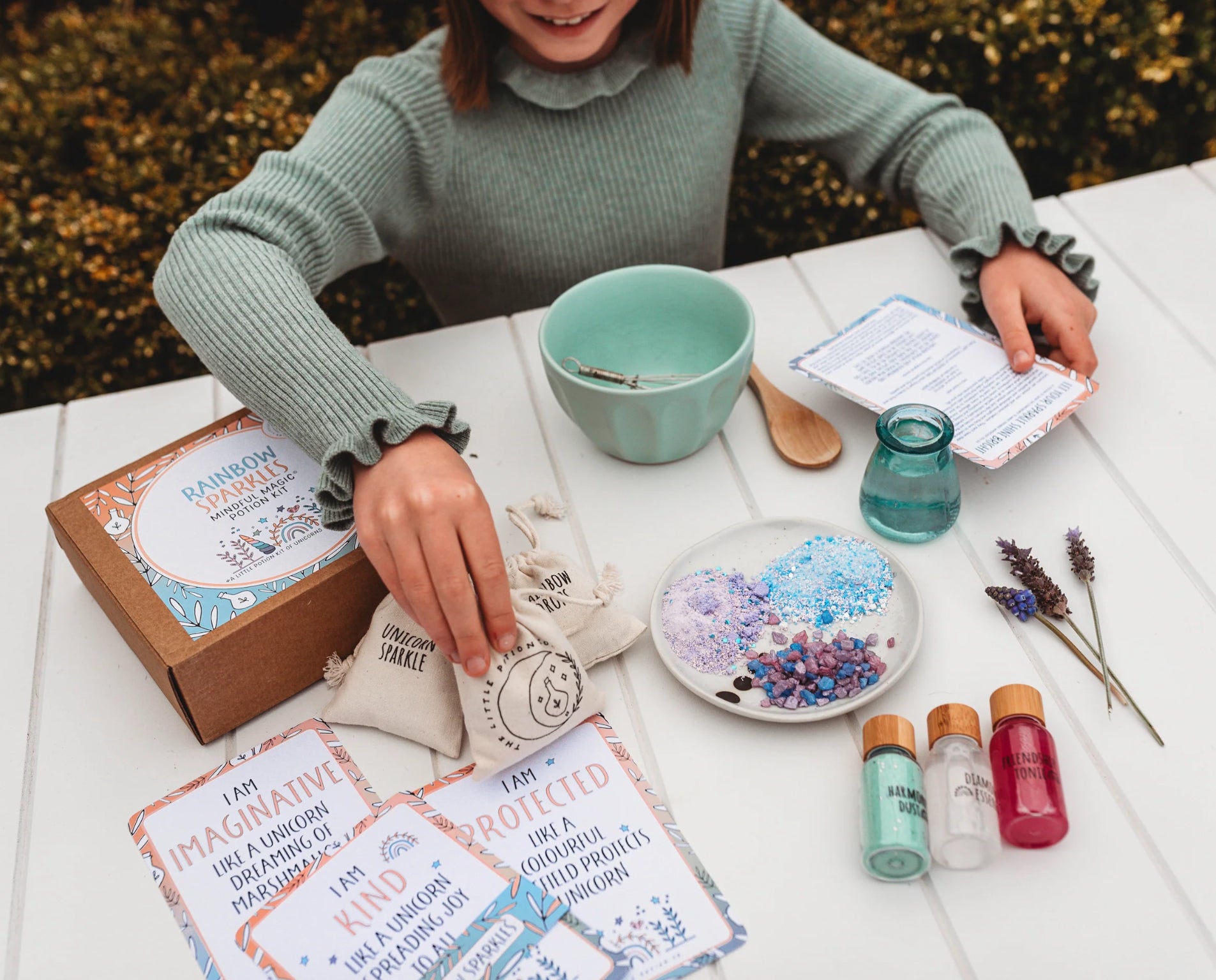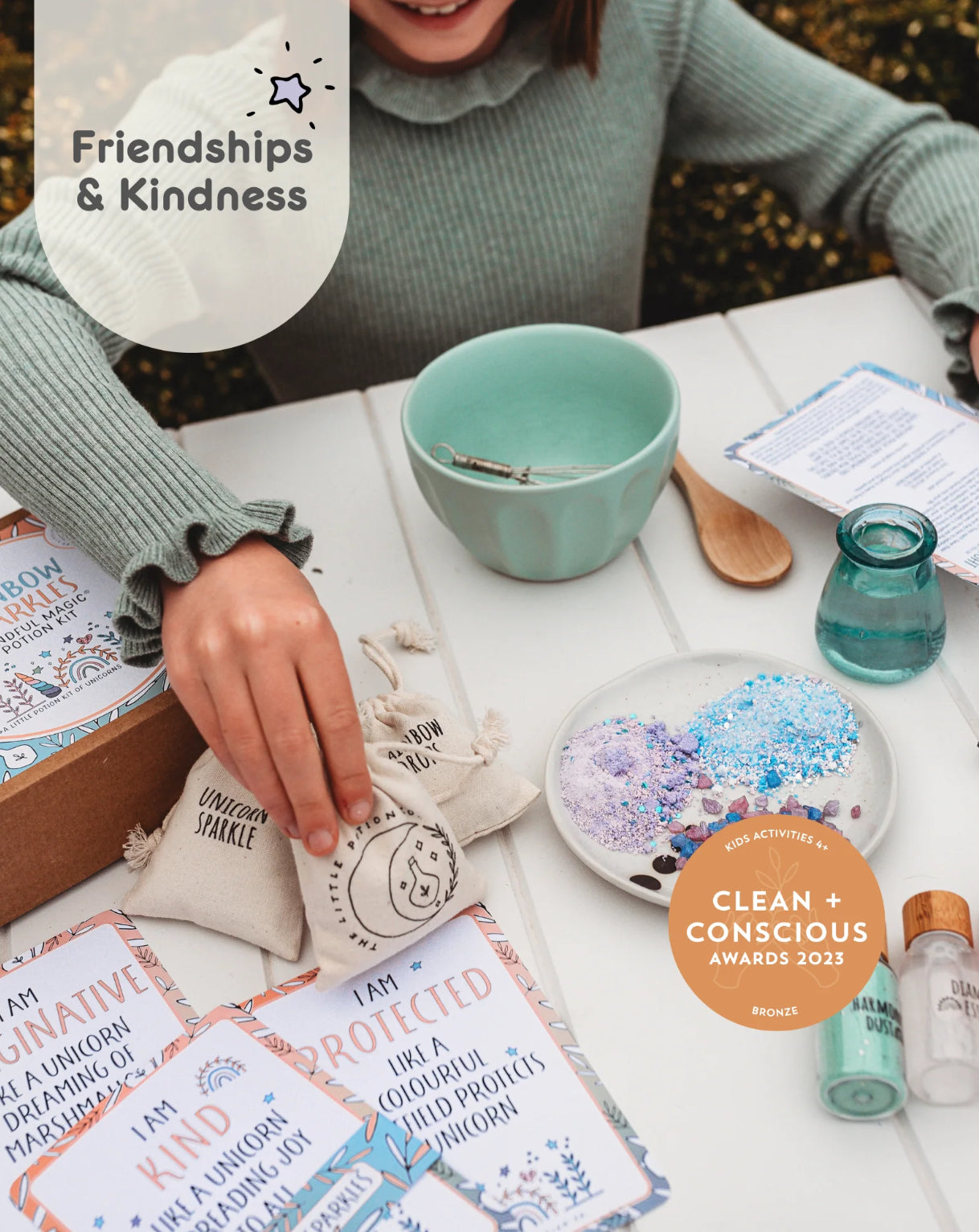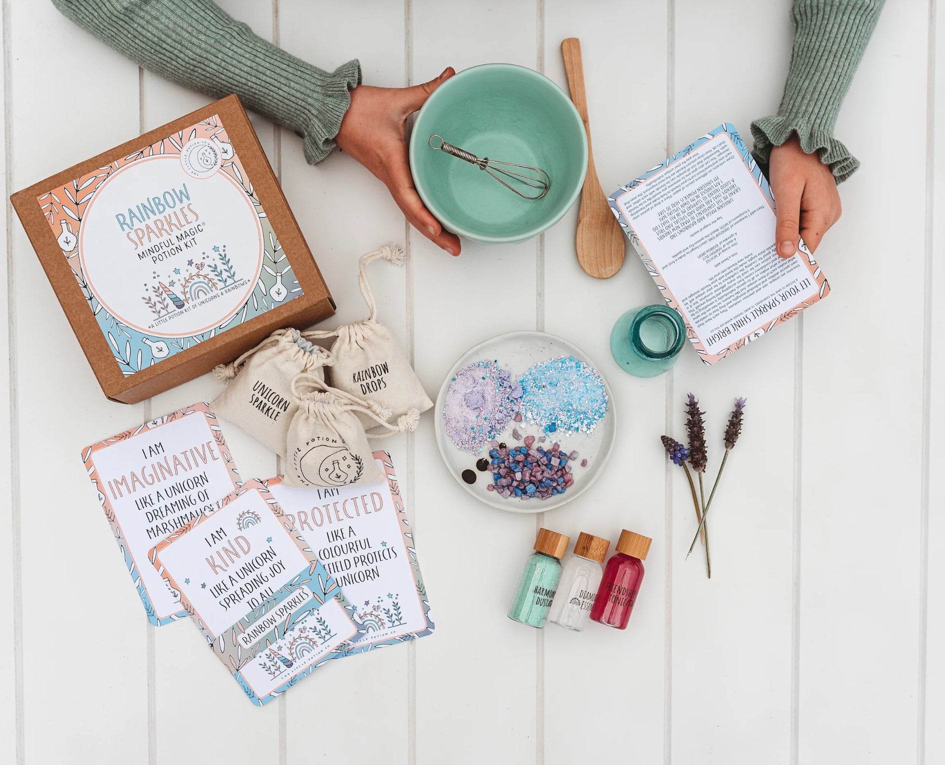 In a colourful world far far away lives the most rainbowy and sparkly creature of all… the unicorn! With hearts full of kindness and happiness, unicorns are known to grant wishes, spread magic and promote harmony to all living creatures. Use this kit to make potions about friendship, rainbow dreams and unicorn wishes.