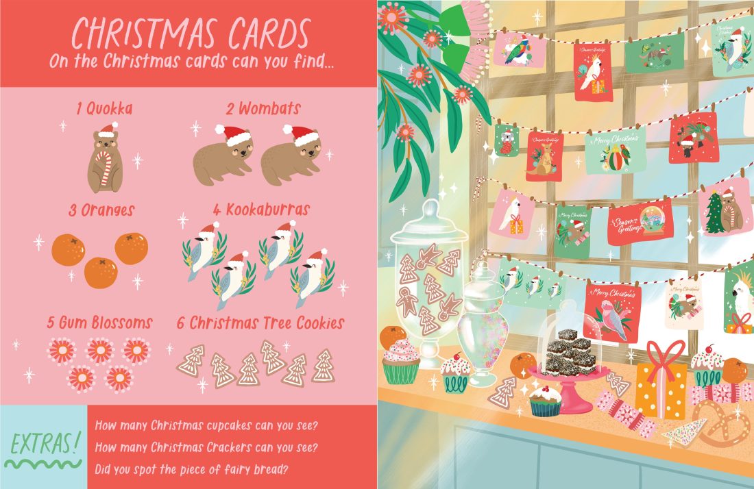 Explore the holiday season Down Under! This search and find book is filled with vibrant illustrations of unique Australian animals with a festive twist. Readers are challenged to find echidnas, galahs, wombats and more within the colourful scenes. It’s Aussie Christmas fun!