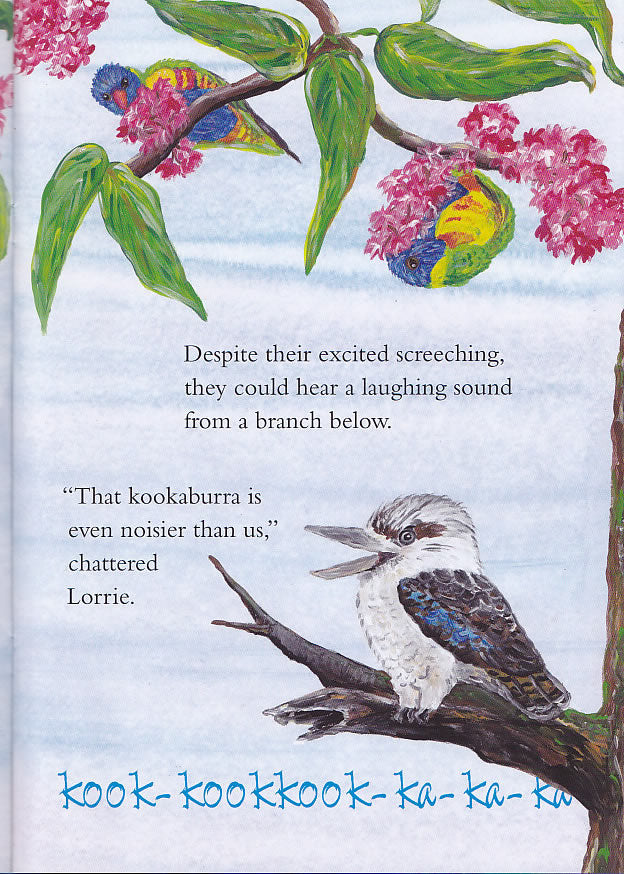The Australian bird children’s book is about a Laughing kookaburra called Bluey. He is flying from place to place. This bird’s call is very distinctive. As a result, he is disturbing a Frogmouth family’s peace. They are trying to sleep. Then, the kookaburra moves on. He lands on an Evodia tree. Rainbow lorikeets are screeching around. While noisy, their noise is not as loud as the kookaburra’s laugh.