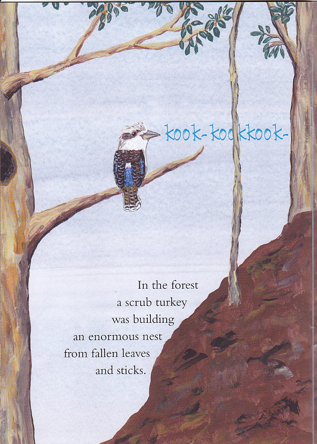 Later, Bluey flies to a tree near two cassowaries. It’s Cassy and her father from a previous book. A Paradise kingfisher is sitting on the same tree. He is the kookaburra’s cousin. After that, Bluey discovers a scrub turkey building her nest. It’s hard work for her in comparison to kookaburras’ nesting behaviour.
