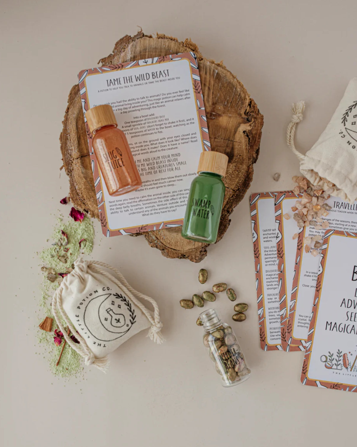 The Wild Adventure Potion Kit is for little potion makers seeking mystical lands and magical treasures. Create potions such as calming down after an adventurous day, conquer fears for new adventures and gain control of stormy weather (and feelings).